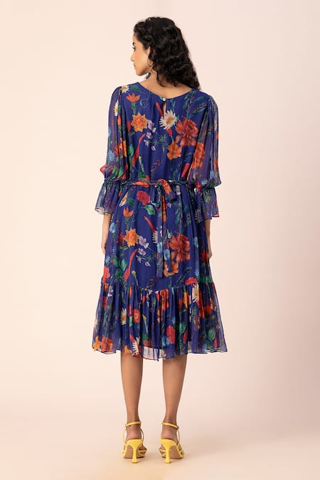 Blue midi dress featuring a floral print and ruffle tier detail at the hem