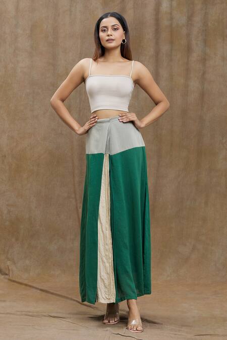 Grey and green colorblock skirt featuring a gold stripe woven placement pattern and pleated detailing