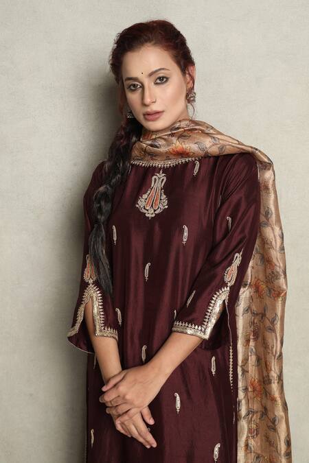 Buy_Falguni.Foram_Brown Kurta Dupion Silk, Pant Viscose Thread And Sequin Embroidered & Set _Online_at_Aza_Fashions