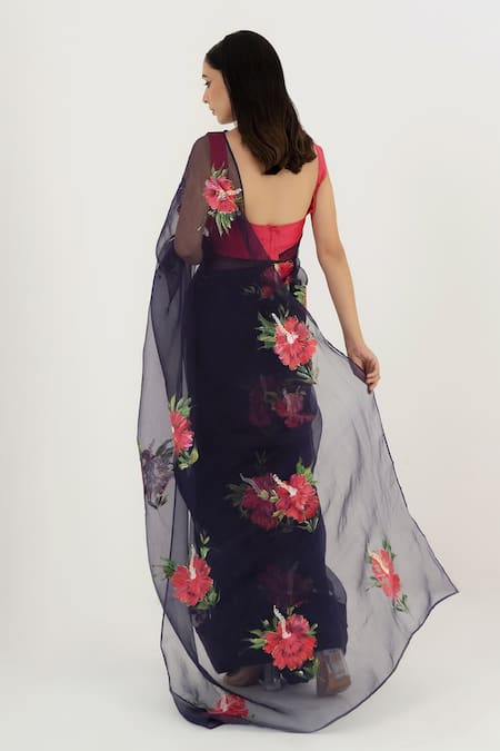 Navy blue imported pure silk organza saree with white, green, red, yellow hand painted bold hibiscus flowers. Comes with running blouse.