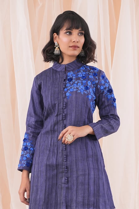 Blue jacket featuring a band collar, full sleeves, and resham embroidery in a floral pattern. Paired with a modal silk satin dhoti pant.