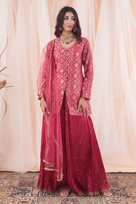 Cardinal maroon red kurta featuring geometric patterns and mukaish work. Paired with a crushed silk sharara and a net dupatta.