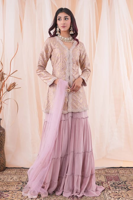 Lavender peplum top featuring V neckline with floral and geometric patterns. Paired with a tiered sharara and a sequin spread dupatta.