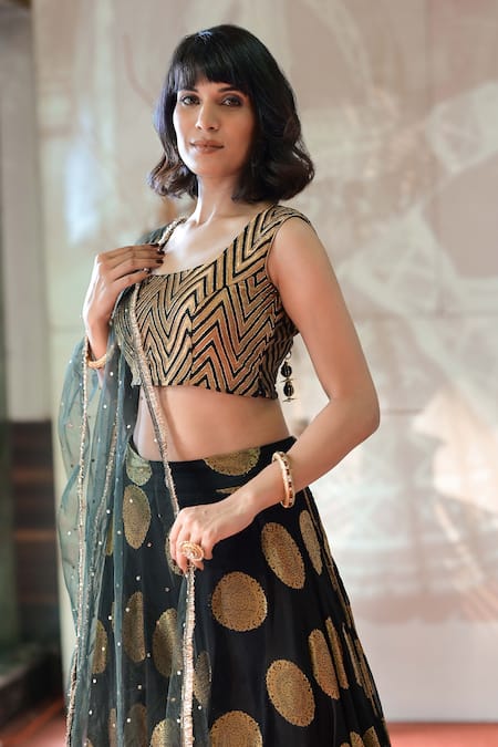 Black lehenga featuring circular geometric motifs, paired with a geometric pattern blouse adorned with cutdana embroidery. Accompanied by a dupatta crafted from tulle net, enhancing the overall elegance.