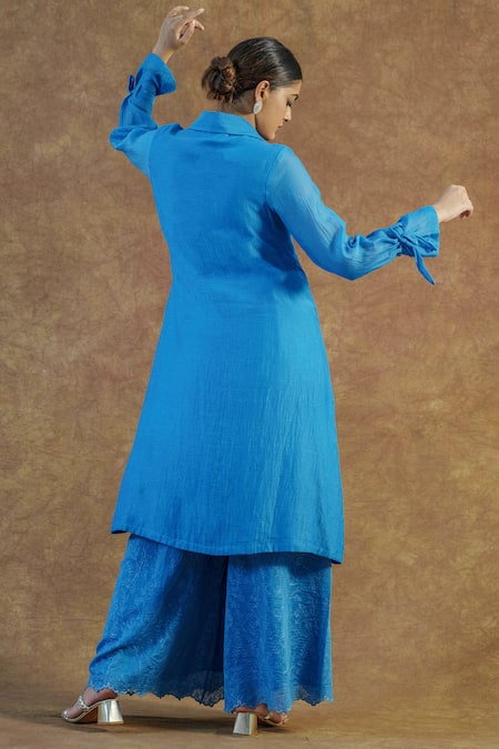 Blue Mul Chanderi Silk Embroidered Thread Lapel Collar Coat And Palazzo Set