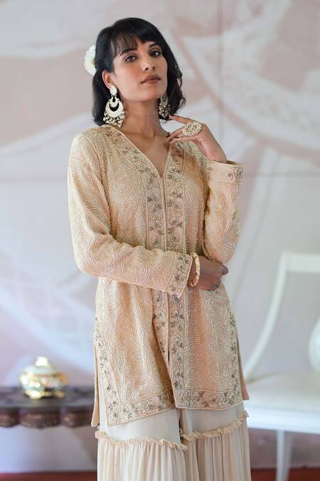 Beige kurta featuring floral cutdana and thread embroidery with a V neck. Paired with a tiered sharara and embroidered organza dupatta.