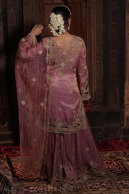 Buy_Farha Syed_Pink Chanderi Silk, Organza, Taffeta Embroidery, Floral Vine Kurta Sharara Set _at_Aza_Fashions