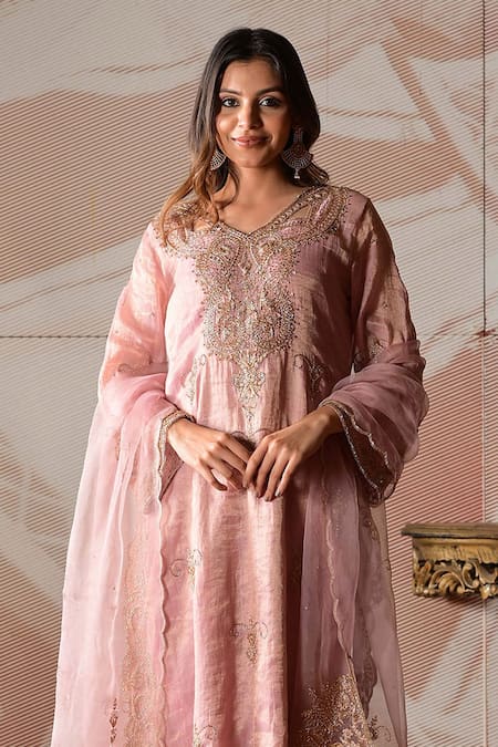 Pink Chanderi, Modal, Silk, Organza Cut Work Embroidered Kurta And Dhoti Pant Set