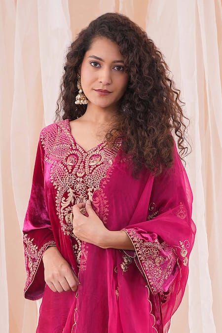 Raspberry maroon pink velvet kurta featuring zari and pita embroidery. Paired with a dhoti pant and embroidered dupatta.
