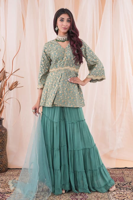 Aqua jade green peplum top featuring floral patterns, a tasseled placket, and scalloped embroidery with cutdana, sequins, and zari zardozi. Paired with a tiered sharara and a sequin spread dupatta.