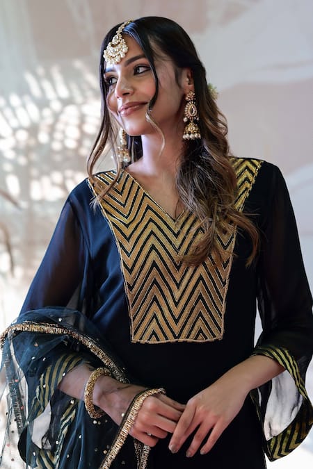 Black kurta featuring a geometric embroidered yoke and flared sleeves. Paired with a matching pant and a tulle net dupatta adorned with thread work.