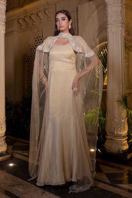 Ivory beige gown made from tissue chiffon featuring a fitted silhouette. Accompanied by a cape crafted from tulle and tissue chiffon with hand embroidery of zardozi, pearls, cut dana, and sequins.