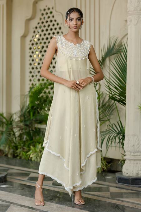 Ivory Tissue, Chiffon, Silk, Satin Pearls, Beige Hand Embroidered Kurta Set