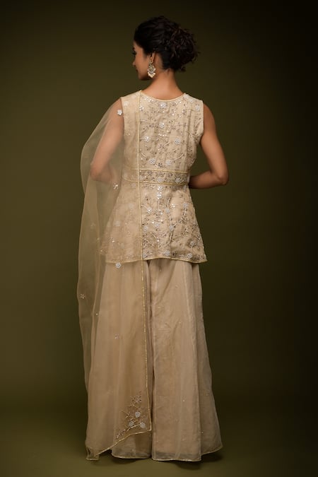 Beige peplum kurta featuring a V-neck, sleeveless design, and front hook closure. Paired with embroidered sharara and a matching dupatta.