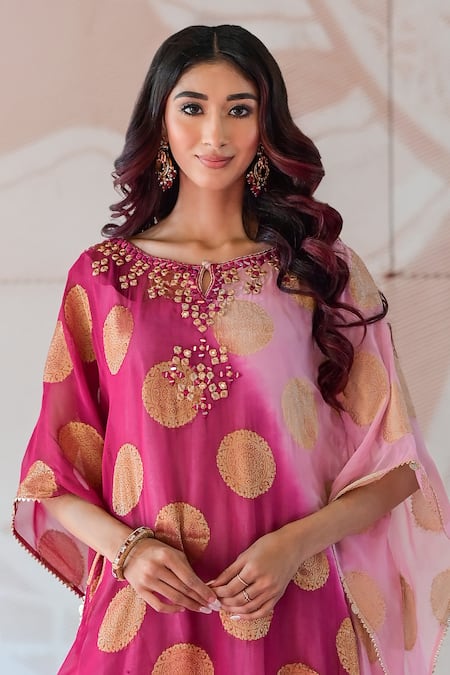 Wine and pink kaftan dress featuring floral woven motifs along with mirror and resham embroidery. It has a keyhole neckline and flared sleeves, enhancing its relaxed fit.
