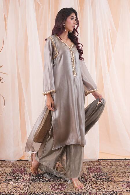 Grey hand embroidered kurta featuring cutdana and pearl stones on the placket, armhole, and sleeve hem. Paired with a plain palazzo, dupatta, and inner slip.