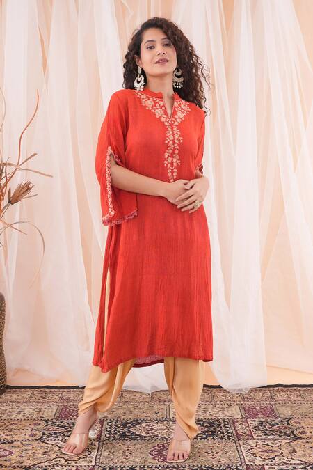 Red kurta featuring floral resham and zari embroidery on the placket and sleeves. Paired with a golden dhoti pant made from modal satin.
