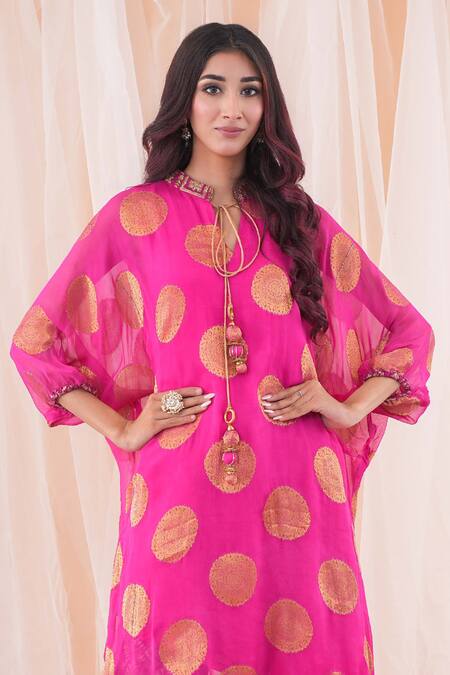 Pink Georgette, Brocade, Polka Dot Banarasi Woven Kaftan Kurta And Pant Set