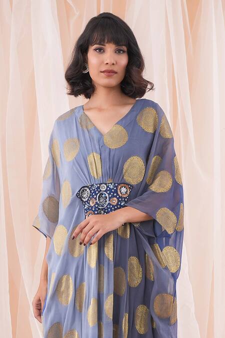 Blue Georgette, Taffeta Embroidery, Sequins V-neck Polka Dot Woven Kaftan Dress