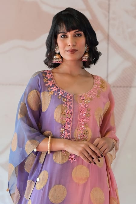 Purple and pink kaftan dress featuring floral woven motifs and mirror and resham embroidery. Paired with a slip for added comfort.