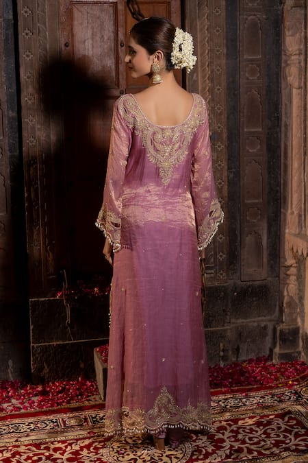 Pink high-low kurta featuring thread dori embroidered floral swirl motifs. Paired with a dhoti pant and a pure organza dupatta, embellished with beads and cutwork.