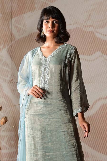 Blue Chanderi, Organza, Handloom Cotton Zari, Zardosi Embroidered Kurta Pant Set