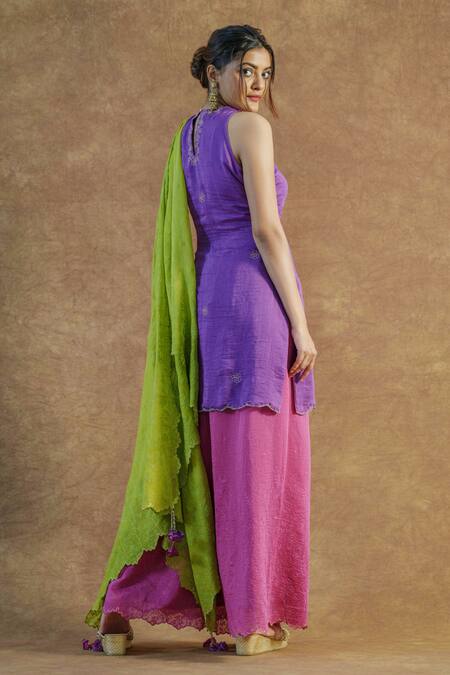 Iris purple kurta featuring hand embroidery with zari, thread, and cutwork details. Paired with pink palazzo and a lime green dupatta.