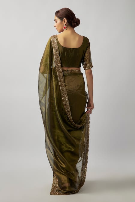 Mehendi green tissue organza saree featuring cutdana hand embroidery. Paired with a padded blouse and an underskirt.