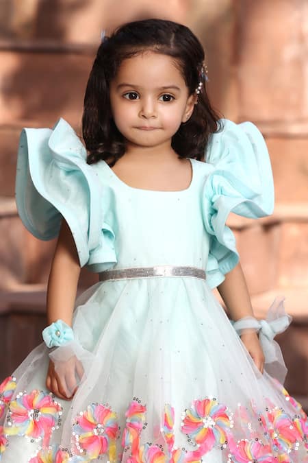 Aqua blue gown featuring 3D floral embroidery and frill sleeves