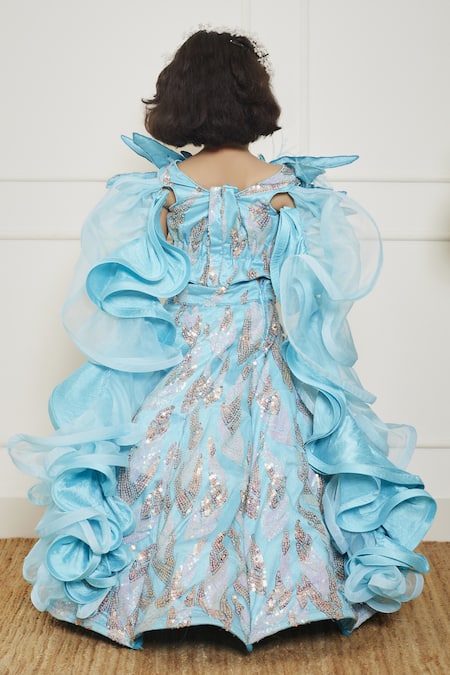 Sky blue crop top featuring 3D sequin embroidery in butterfly applique pattern with attached structured drape on shoulder. Paired with a matching skirt adorned with intricate sequins and flared sleeves.