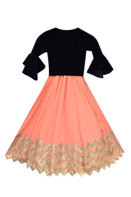 Peach gown featuring a back zippered design and a flared hem with golden zigzag detailing. Paired with a dark blue cropped jacket with flared sleeves and gota patti embellishments.