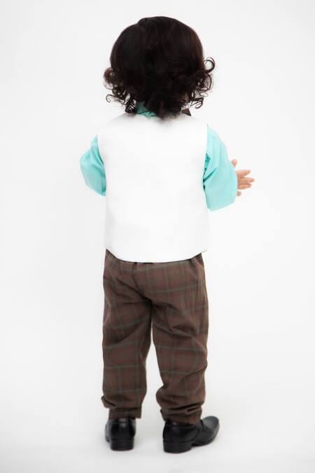 Aqua blue shirt featuring a V neck and full sleeves. Paired with an off-white waistcoat adorned with dinosaur motifs and checkered brown pants.