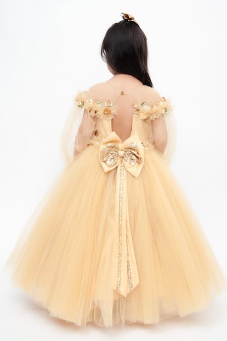 Back cutout with bow detail, Puff sleeves with floral embellishments, Tiered frills with sequin motifs
