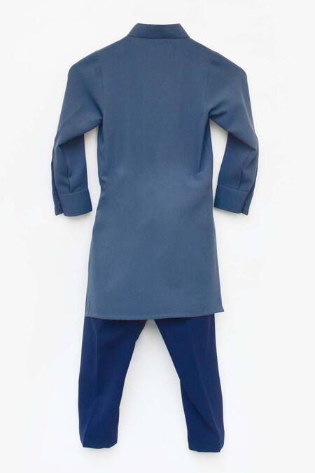 Blue kurta featuring an embellished panel, asymmetrical hemline, and full sleeves. Paired with straight pants and includes side pockets and buttoned cuffs.