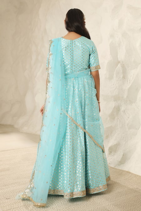 Blue lehenga featuring all over bahar woven detailing. Paired with a floral lace embellished dupatta and an elbow sleeves woven blouse.