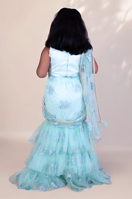Blue ruffle tiered lehenga saree featuring blossom embroidery. Paired with a sleeveless blouse.