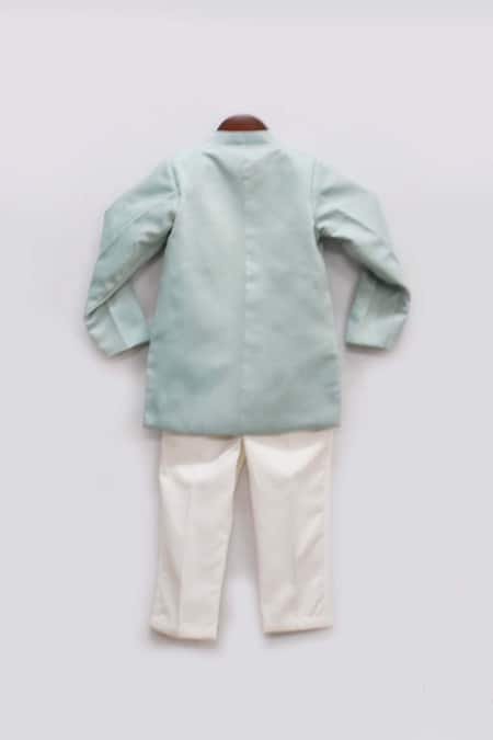 Blue bandhgala featuring deer patch embroidery and a band collar. Paired with cotton pants featuring a semi-elasticated waist.