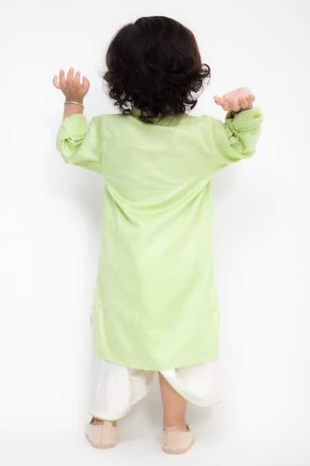 Green kurta featuring an asymmetric button placket and placement embroidered motif. Paired with an elasticated dhoti pant.