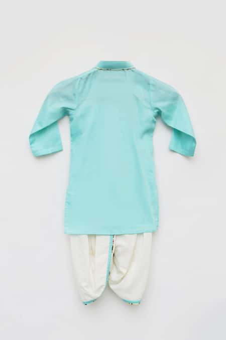 Blue kurta featuring a mandarin collar and full sleeves with front buttons. Paired with a dhoti pant, it includes contrast piping details for added style.