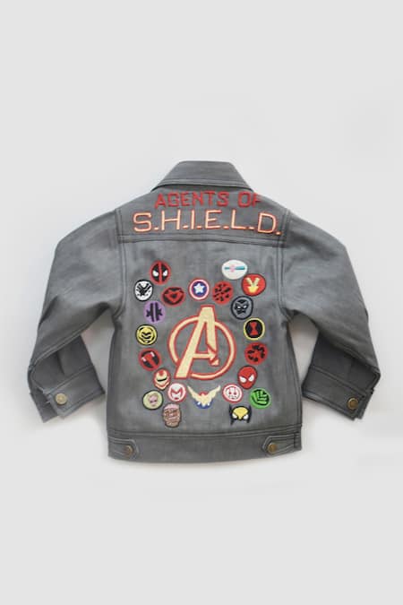 Grey denim jacket featuring embroidered Avenger patchwork motifs and flap pockets
