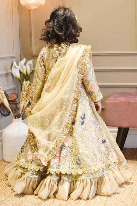 Gold anarkali featuring floral and sequins embellishment with an attached cancan. Paired with an embellished organza dupatta and tassel detailing.