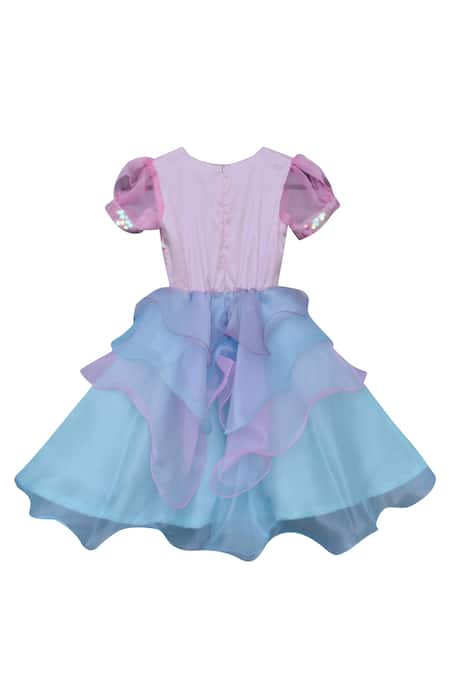 Embellished bodice with sequins, Multi-layered flared silhouette, Puff sleeves with decorative details