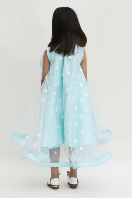 Blue high low dress featuring embellished star motifs and 3D butterflies
