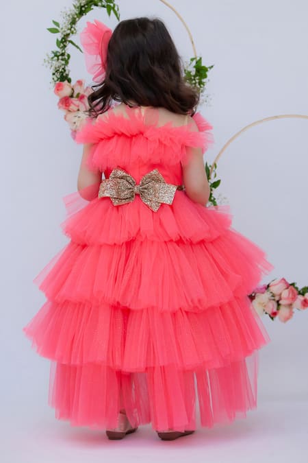 Pink layered high-low gown featuring an embellished bow and frill detail