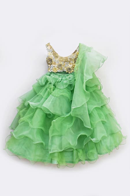 Green lehenga featuring ruffle layers with a shimmer effect. Paired with a ruffle dupatta and a blouse adorned with 3D flowers and sequins.