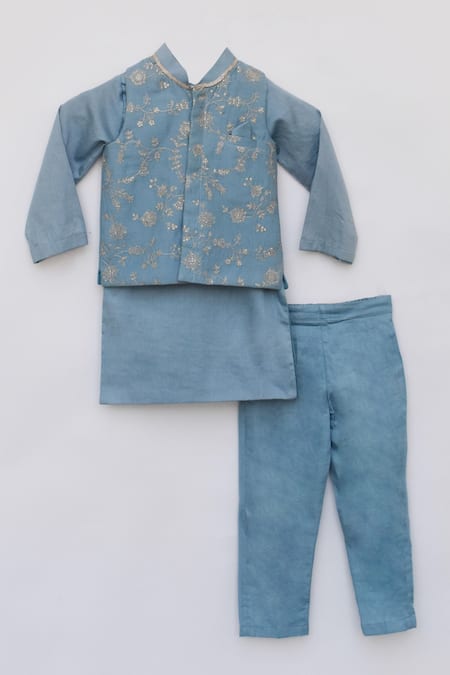 Buy_Fayon Kids_Blue Cotton, Chanderi Embroidery, Lace Bundi And Kurta Set _Online_at_Aza_Fashions