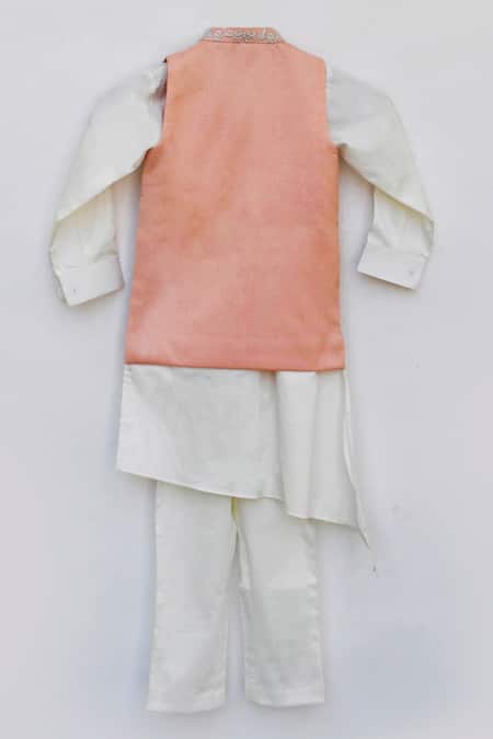 Peach bundi featuring bird and floral embroidered motifs with front buttons and a patch pocket. Paired with an asymmetric kurta and pant in cotton silk fabric.