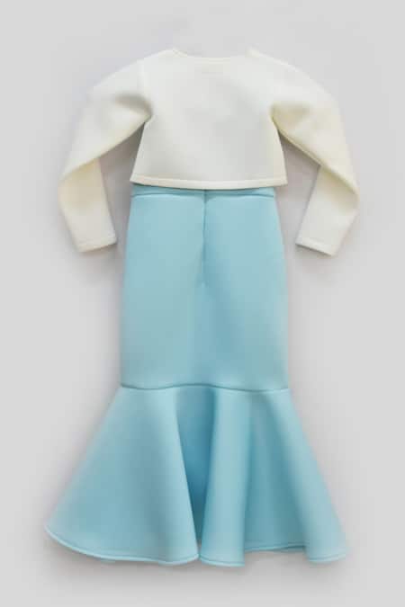 Blue fish cut dress featuring 3D floral applique motifs. Paired with a matching 3D applique jacket.