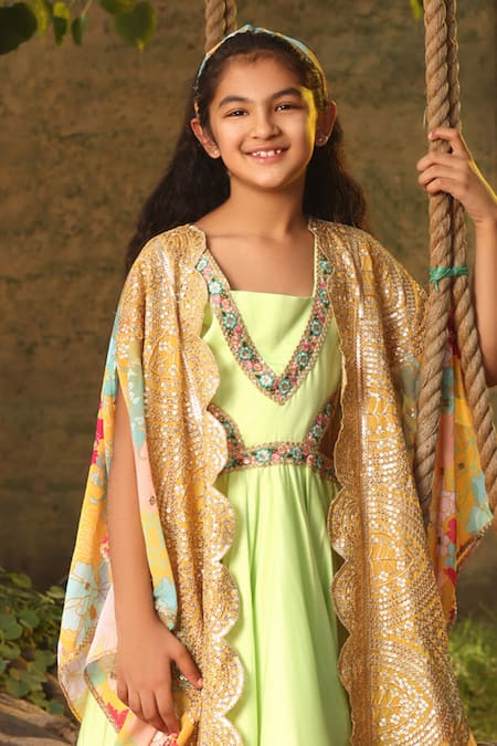 Green glace cotton jumpsuit featuring lace embroidery and side cut-outs. Paired with a floral printed cape with flared sleeves.