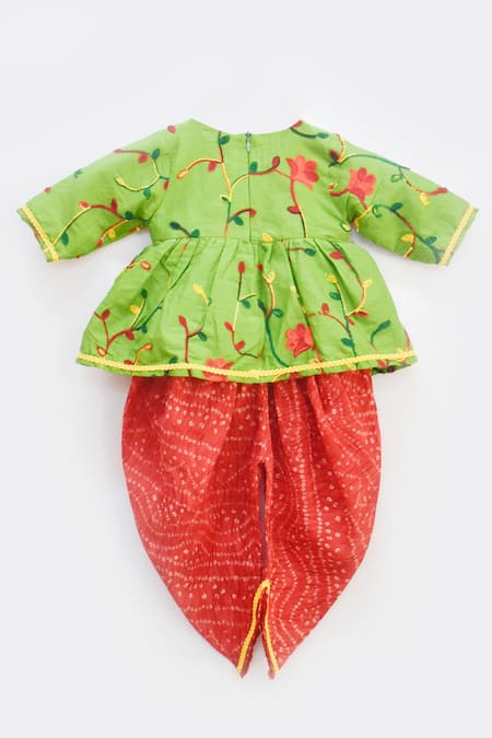 Green peplum style kurta featuring floral embroidered motifs and mirror work. Paired with red printed dhoti pants and embellished with lace trim on kurta hems.